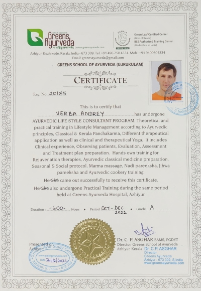 He has been practicing and studying yoga since the early 90s. He has many years of experience in training both with Russian-speaking masters and in ashrams in India according to the Himalayan yoga system, as well as transmission from Buddhist realized masters. In recent years, he has been studying and practicing Ayurvedic methods from masters in Kerala.
