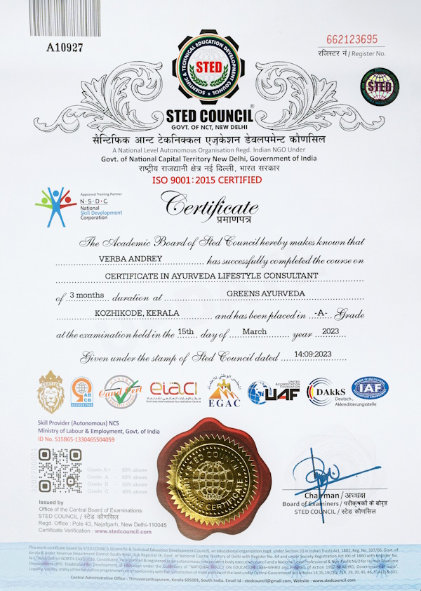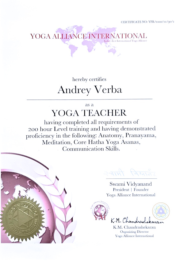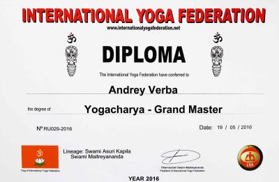 Qualification as a high-level yoga specialist is confirmed by the International Yoga Federation: certified as Yogacharya – Grand Master.
